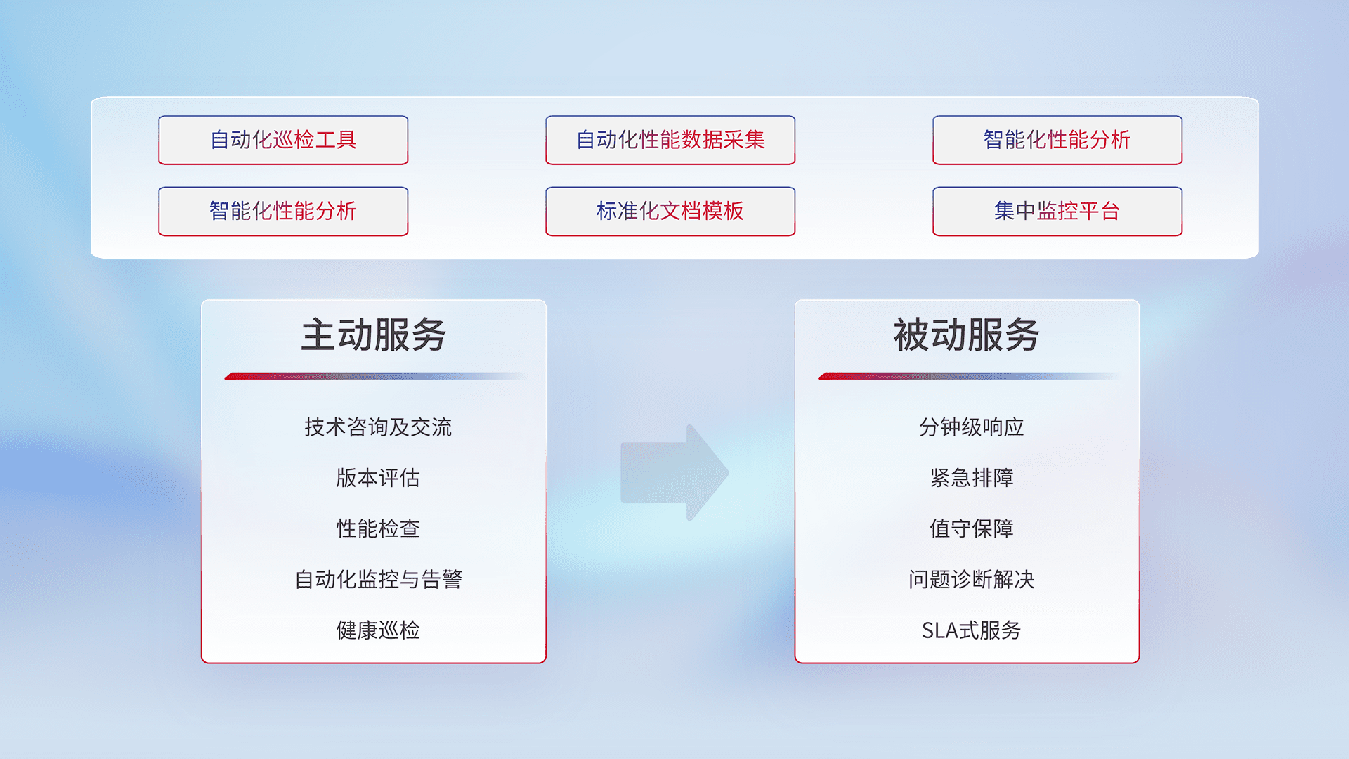 智能化工具和标准化文档,,保障服务质量,,,,提供主动服务(包含技术咨询、、版本评估、、性能检查、、、自动化监控与告警、、、健康巡检)和被动服务包含(分钟级响应、、、紧急排障、、值守保障、、、问题诊断解决、、、SLA服务)。。。。