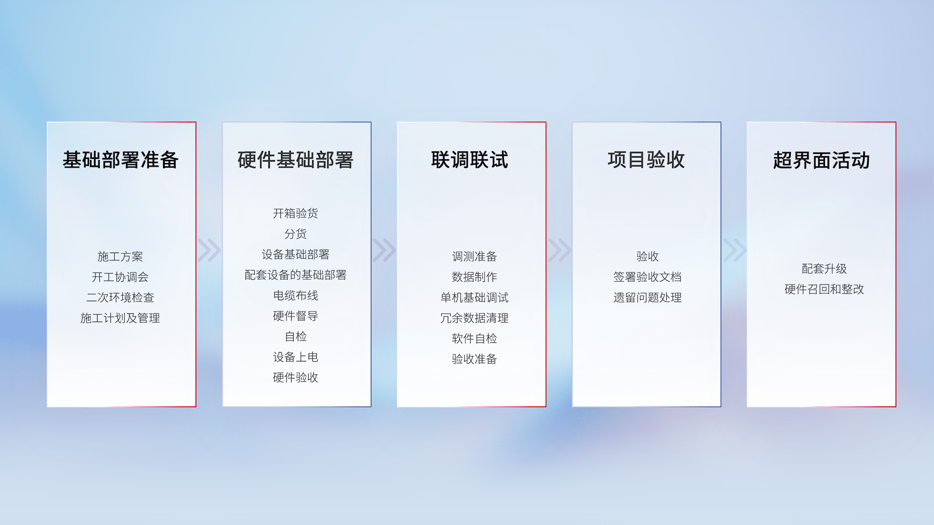 从基础部署准备、、硬件基础部署、、、、联调联试、、项目验收、、、越界面活动的全过程可追溯,,保证施工质量和进度。。。